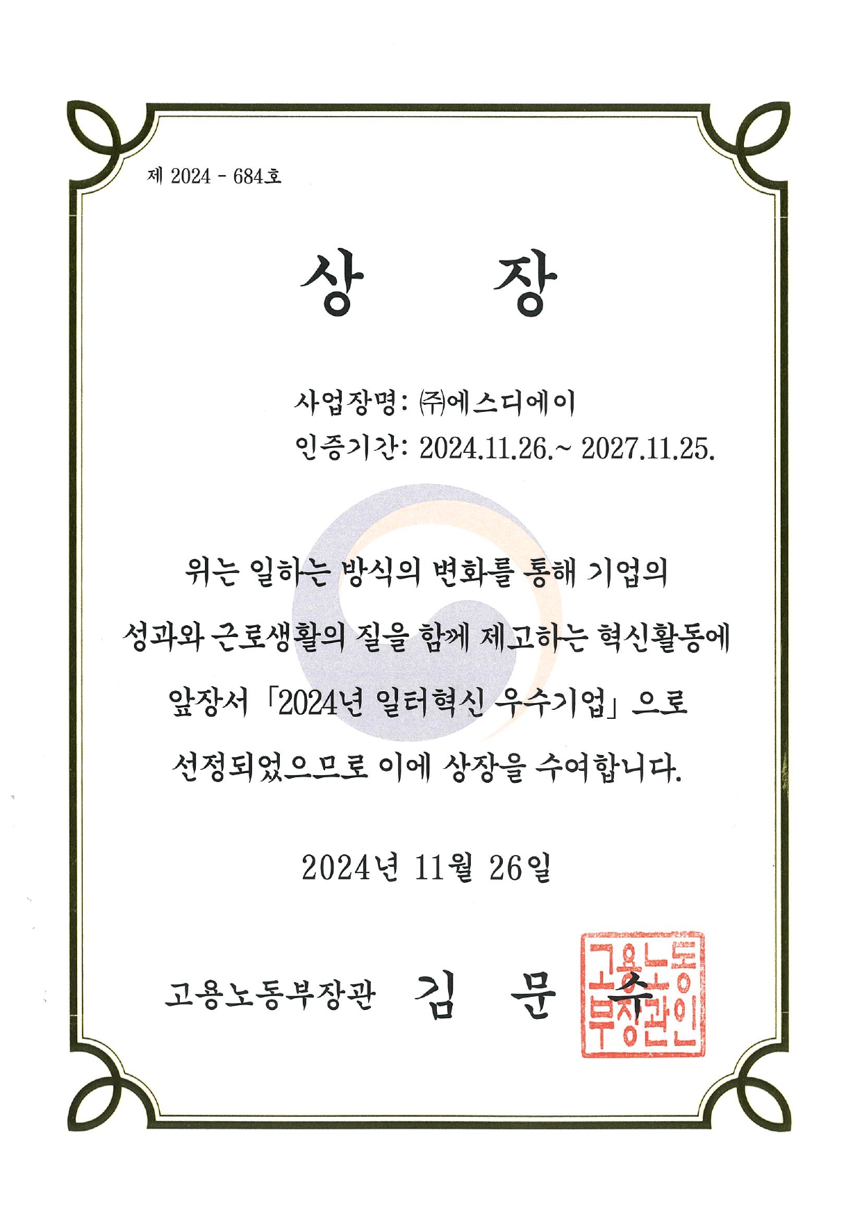 Ministry of Employment and Labor / Labor-Management Development Foundation's Selection of Outstanding Companies for Workplace Innovation